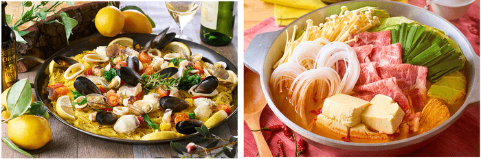 左:サフランライスとたっぷりの具材が目にも美味しい、海鮮パエリア。
