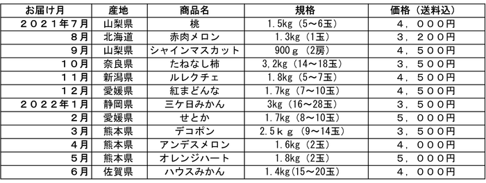 この商品は、毎月、全国から厳選した旬のおいしい果物が産地直送で自宅に届きます。7月の山梨県産「桃」からスタートし、愛媛県産「紅まどんな」や熊本県の「アンデスメロン」など、一年中おいしい果物を食べたいという方にはピッタリのコースです。また、お試し用の6ヶ月コースもあります。