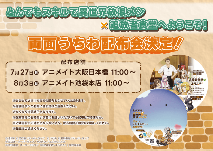 TVアニメのシーズン1が再放送中、さらに10月よりシーズン2も始まる『とんでもスキルで異世界放浪メシ』と、TVアニメ放送中の『追放者食堂へようこそ!』が、どちらも7月25日にコミックス最新巻発売決定!