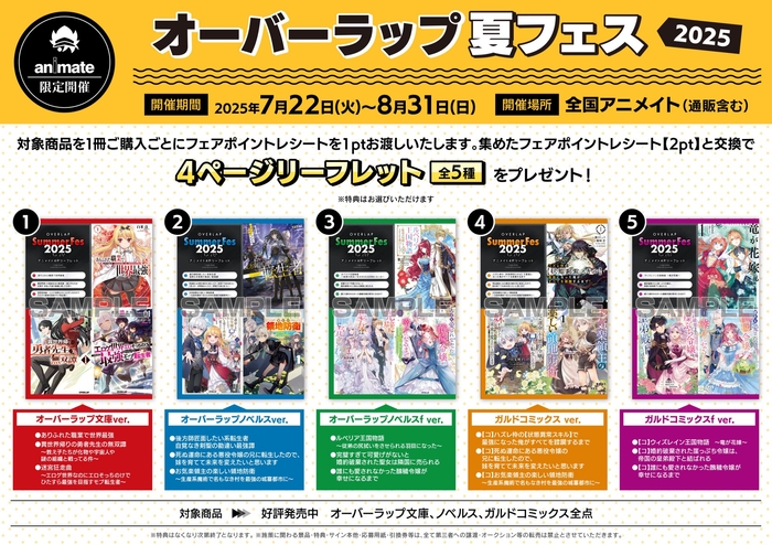 株式会社オーバーラップ(代表取締役社長:永田 勝治、所在地:東京都品川区)は、7月25日にオーバーラップ文庫・オーバーラップノベルス・ガルドコミックスの新刊が発売されるのにあわせ、書籍を購入すると『とんでもスキルで異世界放浪メシ』や『お気楽領主の楽しい領地防衛』など人気作の限定しおりがもらえる「オーバーラップ夏フェス2025」を開催いたします。
