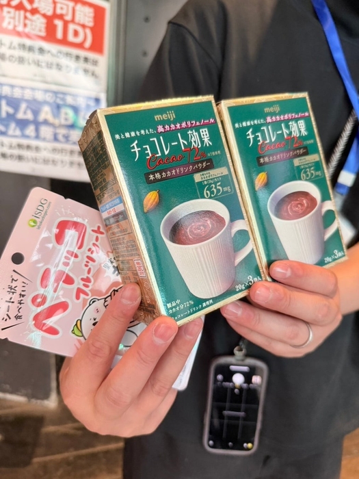 のむチョコレート『チョコレート効果 本格カカオドリンクパウダー』(3袋入り/明治)とシート状で食べやすい『ぺラッコ フルーツシート』(ピンクグレープフルーツ&梅味/iSDG)がイベントロゴ入りのオリジナルな袋に入れられて、配られていた。こういうアイテムがもらえるアイドルフェスは珍しかったかも!!!! ライブで消費したカロリーをここで回復。
