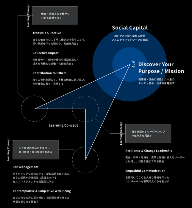 以下のラーニングコンセプトと共に対話と内観を深めていくプロセスを経ながら、自らの心のOSをアップデートし、各々の価値観・人生経験・内発的動機に基づく「持続的なリーダーシップの在り方」「人生を活かすテーマ」を見出していただく結果を目指します。