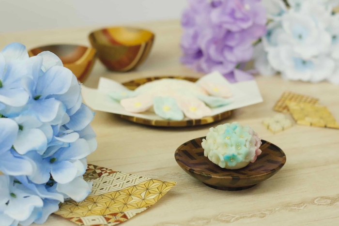 ・茶室であじさいの和菓子とあじさいかき氷を提供