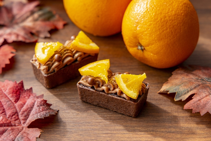 オレンジのコンフィ入りのガナッシュを敷き詰めた濃厚なチョコタルト。中に忍ばせたクッキーとミルクチョコのシリアルが食感のアクセントになっています。
