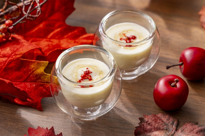 じゃがいもの冷製スープに秋の味覚である梨のピューレを合わせたさわやかな一品です。トップに添えた鮮やかなピンクペッパーが、彩りと香りのアクセントになっています。