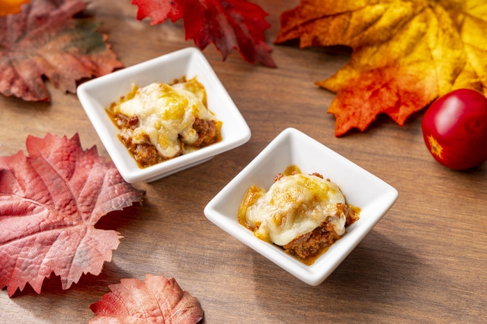 牛ひき肉を赤ワインとフォンドヴォーでじっくり煮込んだ本格的なボロネーゼに、旬の柔らかい秋茄子を合わせ、オーブンで焼き上げたグラタンです。