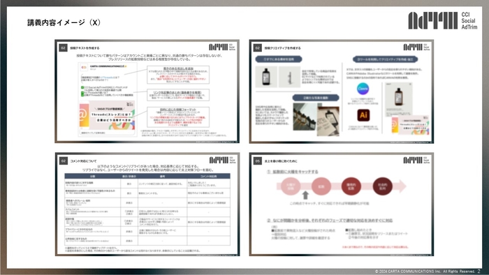 投稿企画の考え方からクリエイティブの作り方に関するTIPS、各SNSのアルゴリズムに加え、過去の炎上事例やインフルエンサー活用の際の注意点など、すでにSNSを活用している企業様向けの内容も含まれております。新入社員研修などにも最適なパッケージとなっておりますので、是非ご活用をご検討下さい。
