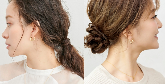 ハートやスターモチーフのミニフープピアス。普段取り入れない方でも、メタルデザインが洗練させた雰囲気で、大人可愛い印象に仕上がります。