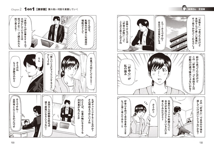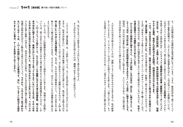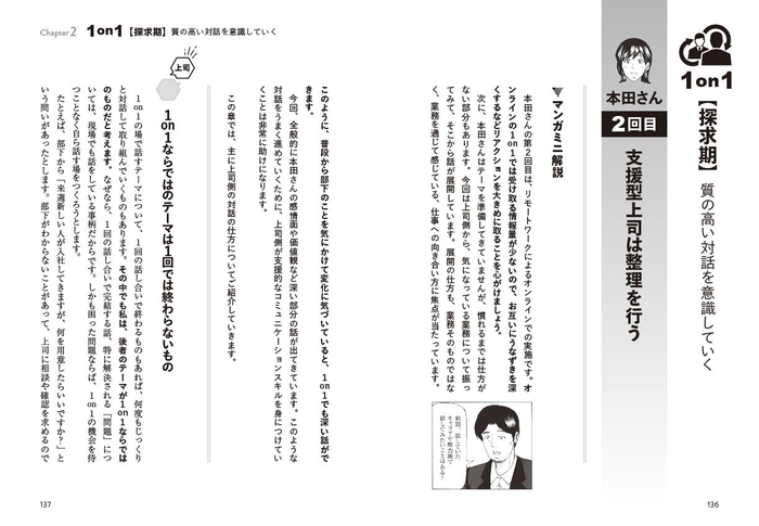 本書では、そんな「第3フェーズ」に入った1on1ミーティングを実りあるものにするために必要なコミュニケーションのポイントを、マンガを中心にわかりやすく解説。