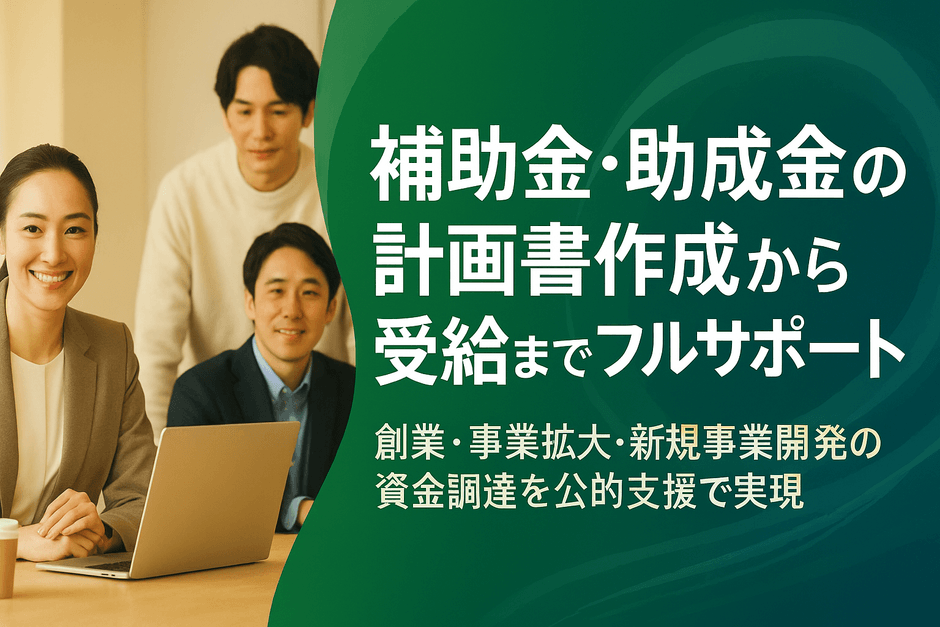 本サービスでは、補助金・助成金の制度選定、事業計画策定、申請書類作成、採択後の実績報告・受給までをワンストップで支援。