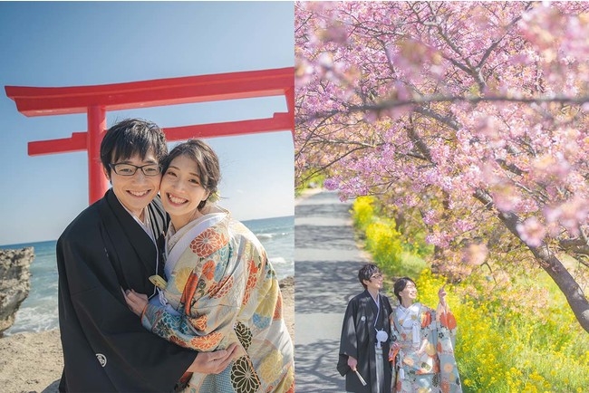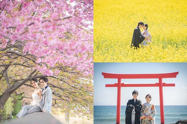 河津桜と周辺寺社で、和にふさわしい結婚写真を