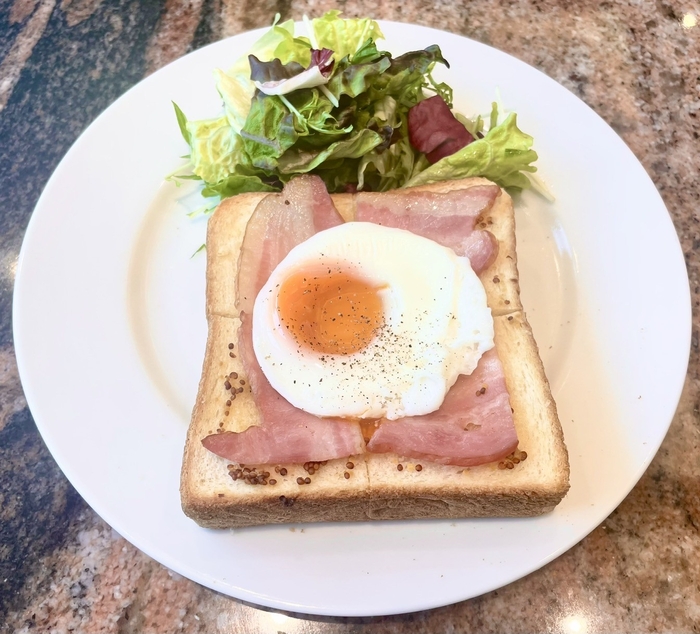 【ミートソーストースト、ベーコンエッグトースト、バタートースト(蜂蜜&ジャム)、クロワッサン、パン・オ・ショコラ】