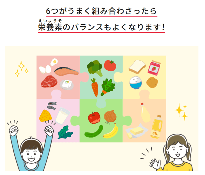 新コンテンツは、その五大栄養素をバランスよく摂取するための「6つの基礎食品群」をテーマにしています。小学校高学年から中学生の成長期は、体が大きくなるとともに活動も盛んになる時期です。同時に体型を意識しはじめる時期でもあります。極端なダイエットをして栄養が不足すると、体調不良や肌荒れにつながります。成長期という大切な時期だからこそ、さまざまな食品を上手に組み合わせ、栄養バランスのとれた食習慣を身につけて、健康な食生活を送れる大人になってほしいと期待しています。