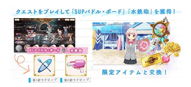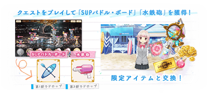APを消費し、本イベントのクエストをプレイすることでイベント限定ショップで交換に使えるアイテム「SUPパドル・ボード」「水鉄砲」や特定のクエストを解放できるフラグメントを獲得できます。