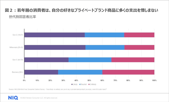 調査結果から明らかになった事は、“値段が高くても、自分が気に入ったプライベートブランド商品を買う”と回答した消費者属性である。“プライベートブランド商品にもっとお金をかけてもいい”と回答したミレニアル世代(46%)とZ世代(46%)の割合は、同じ質問に“いいえ”と回答したベビーブーマー世代(23%)の2倍であった(図2)。NIQが2024年に発表した「Spend Z」レポート1でも明らかなように、該当の二世代は価格にこだわらずプライベートブランド商品を購買している。またミレニアル世代とZ世代の購買客が、今後数年のうちに驚異的な消費力を持つようになり、商品の嗜好やブランドロイヤリティの形成は彼らの中ですでに始まっている。