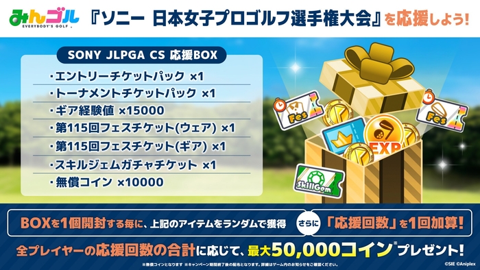 期間中、イベントログインボーナスやイベントコースのプレイを通じて獲得できる「SONY JLPGA CS 応援BOX」を1個開封する毎にランダムでアイテムが獲得でき、かつ応援回数が1回加算されます。