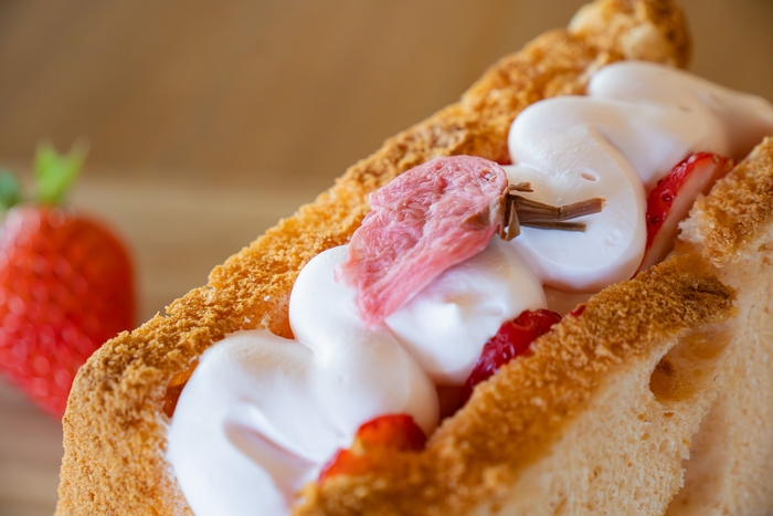 この特別な春のデザートは、桜の香りが広がるクリームと、イチゴのさっぱりとした風味が絶妙に調和し、しつこくない爽やかな味わいが特徴です。