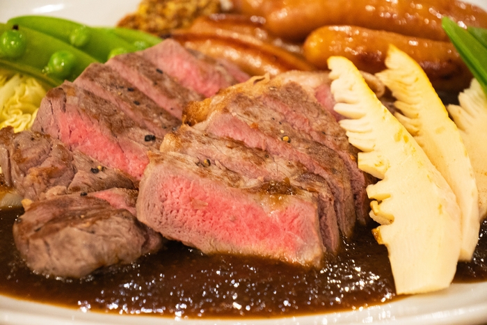 桜の季節に合わせて、美味しい牛ステーキをメインにした特別なコースが登場。サラダ、前菜3種、揚げ物料理2種、ご飯物1種、デザート1種に90分の飲み放題が付いています。