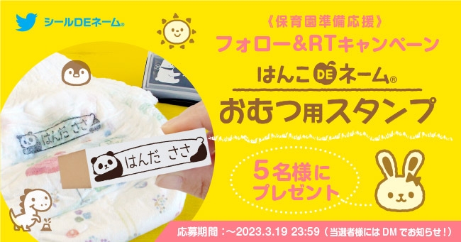 《本日開始》Twitterフォロー&リツイートで保育園準備に役立つ「おむつ用お名前スタンプ」が5名様に当たる!3/15よりキャンペーン開始