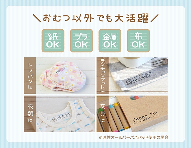 付属のインク台は、紙・プラ・金属・布に対応!衣類や文具、紙おむつからトレパンなどにも引き続き使うことができます。もちろんお洗濯もOKです。