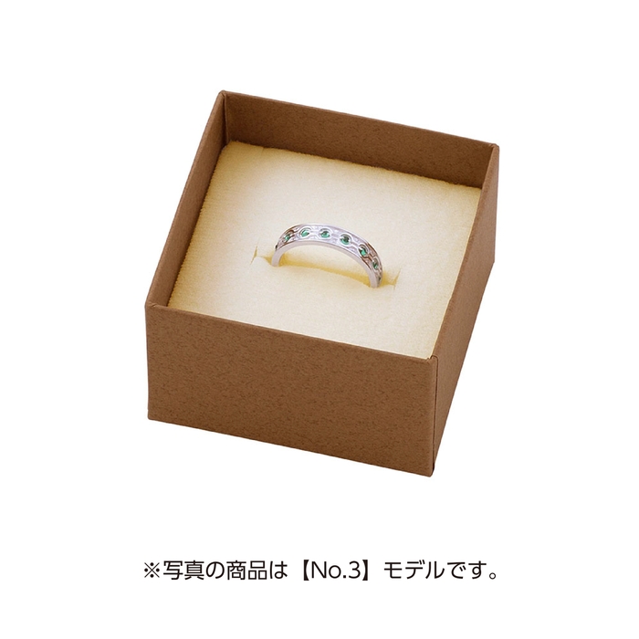 幅の太い平打ちリングに模様を取り込み、グリーンの石を留め表現しています。
