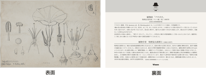 牧野富太郎博士がスケッチしたアサガオの植物図カードです。スケッチの手本としてもお使いいただけます。カード裏面には、アサガオの説明と牧野富太郎博士のプロフィールを記載しています。