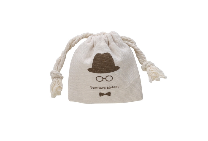素朴な風合いの巾着型収納ケースです。収納ケースにも植物学者、牧野富太郎博士のトレードマークのデザインが入っています。