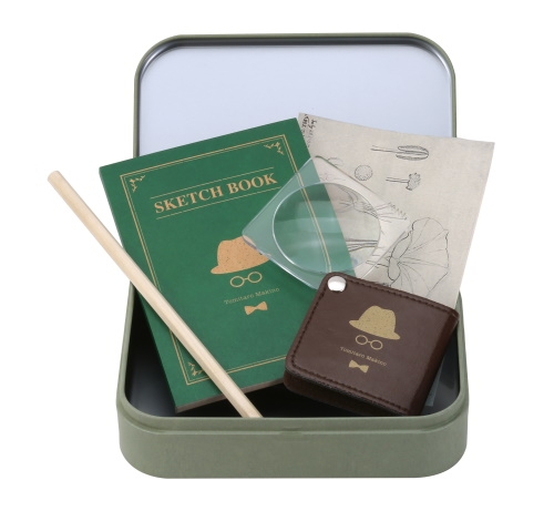 植物をこよなく愛した植物学者の牧野富太郎博士が、植物採集・観察の際に愛用していたアイテムをイメージしたセットです。牧野式胴乱をモチーフにした缶ケースの中に、植物観察用のポケットルーペ、耐水紙のスケッチブック、スケッチに適した2Bえんぴつ、牧野植物園監修の植物図カードがセットされています。