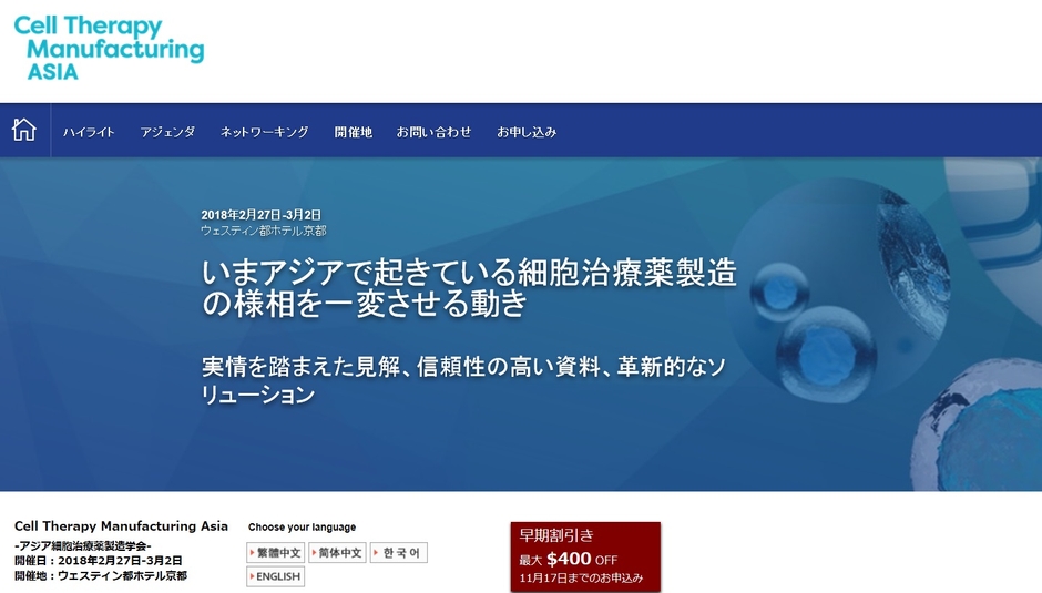 国際学会 「アジア細胞治療薬製造学会」(IBC Life Sciences主催)の参加お申込み受付開始