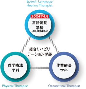 森ノ宮医療大学は2024年4月、総合リハビリテーション学部に言語聴覚士を養成する「言語聴覚学科(仮称・設置構想中)」の設置を予定しています。新学科設置によって、総合リハビリテーション学部には、理学療法学科、作業療法学科、言語聴覚学科(仮称)の3分野が揃います。この3学科が連携することで、リハビリテーション分野における本学の学びの領域は大きな広がりをみせ、さらに学びが深まります。