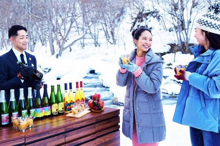 奥入瀬(おいらせ)渓流沿いに建つ唯一のリゾートホテル「星野リゾート 奥入瀬渓流ホテル」では、2023年2月1日、銀世界が広がる渓流でせせらぎとホットシードルを味わう「渓流雪見シードルバー」が新登場します。目の前には奥入瀬渓流が流れ、せせらぎや野鳥の声が響き、雪景色が広がる幻想的な空間で、青森県の醸造所から厳選した3種類のあつあつのホットシードルを味わい、豊かな時間を過ごせます。