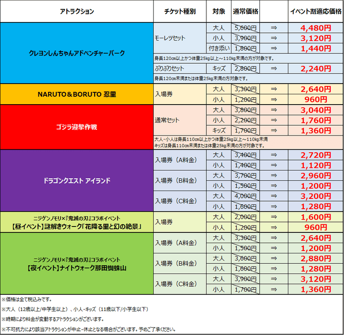 「ドラゴンクエスト アイランド」入場券は、大人は通常 3,400 円~4,000 円が 2,720 円~3,200 円に、小人は通常 1,400 円~1,600円が 1,120円~1,280円となります。「NARUTO&BORUTO 忍里」入場券は、大人は通常3,300円のところ2,640円に、小人は通常 1,200 円のところ 960 円でご購入いただけます。その他の各アトラクションも同様に 20%OFF のお得な価格でチケットをご購入頂くことが可能です。