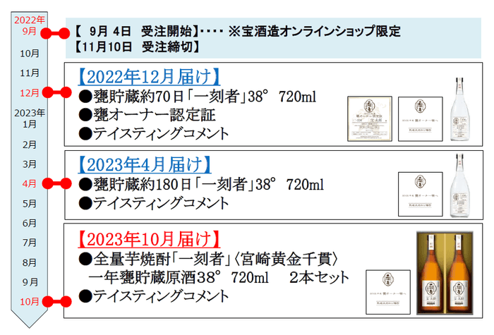 オーナー様には、石蔵甕貯蔵開始から約70日・180日・一年の製品を3回にわたってお届けすることで、時間の経過と共に熟成・洗練されていく「一刻者」の味わいの変化をご体感いただけます。加えて、「甕オーナー認定書」、黒壁蔵工場長によるテイスティングコメント、オーナー様の名入りラベルなど、「甕オーナー」だけが体験できる特典をご用意しています。
