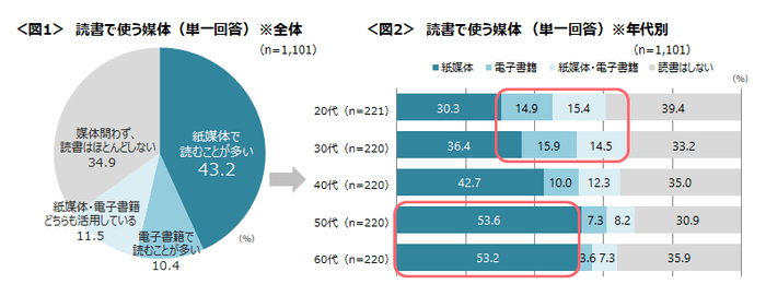 年代別にみると、20-30代は「電子書籍で読むことが多い」と「紙媒体・電子書籍どちらも活用している」計がそれぞれ約3割と、若い世代ほど電子書籍の利用が進んでいることがうかがえる。一方、50-60代の約半数は「紙媒体で読むことが多い」と回答。<図2>