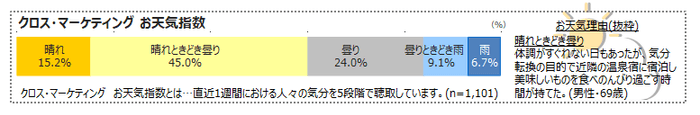 クロス・マーケティングお天気指数とは、直近1週間における人々の気分をお天気で表したものです。お天気の理由も一部抜粋してお知らせします。