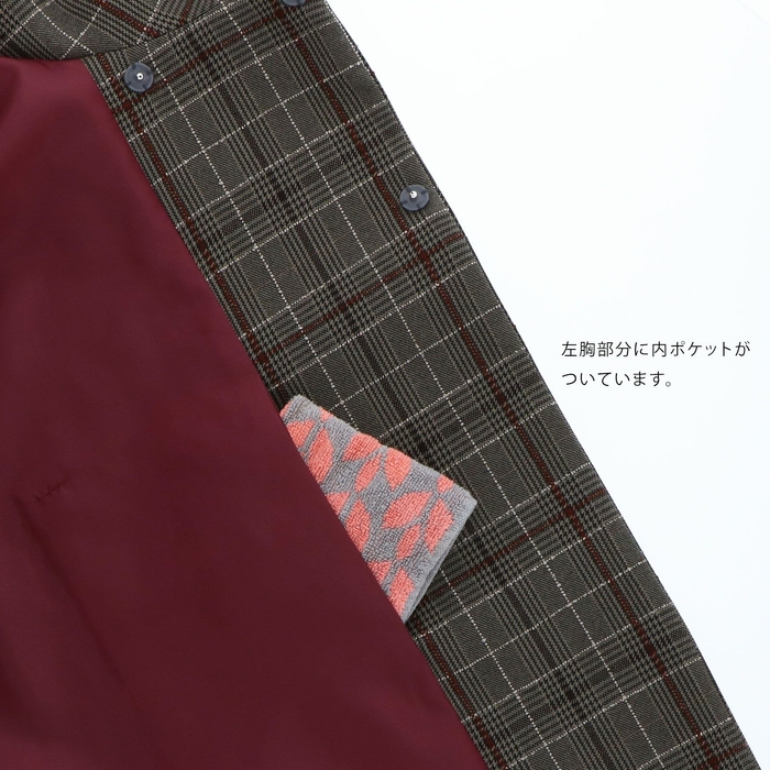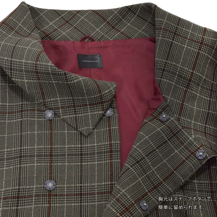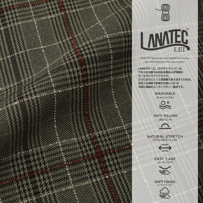 LANATEC LEIとは動物性繊維や石油系ドライクリーニングを必要としないエコな高機能ファブリックで、シワになりにくくて洗濯機で洗えるすぐれもの。素材はウールライク。やや薄手で軽く、やわらかなふくらみのある風合い。ピリング(毛玉)もできにくく、お手入れ簡単で肌触りのよい生地。モールヤーンを使用し、部分的に凹凸感のある表面感もポイント。柄はアッシュグレー×黒×ワイン色の複雑な色合いがウォールナットを想起させるクラシカルなチェック模様。着物はもちろん、洋服にもお洒落にコーディネートできるデザインとなっている。