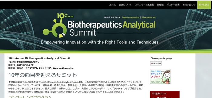 会議:「10th Annual Biotherapeutics Analytical Summit-第10回生物学的製剤分析サミット」