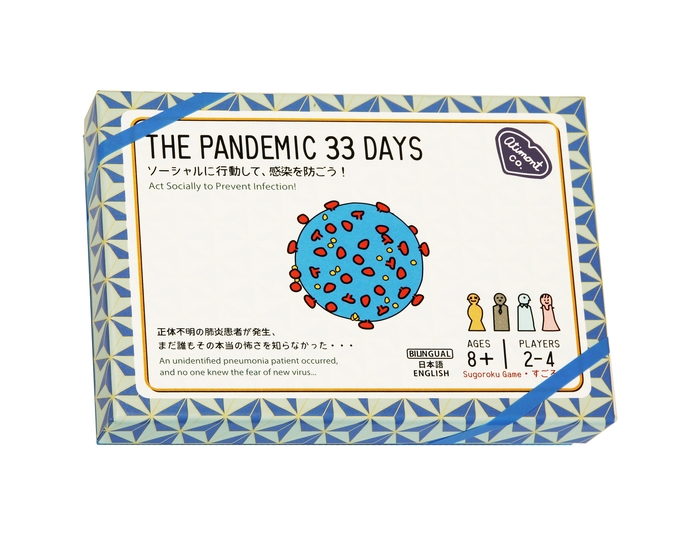 「THE PANDEMIC 33 DAYS」は“新型肺炎が発生するニュース”からスタートし、“集団免疫達成!”でゴールするというゲーム展開。「ソーシャルディスタンス」「ロックダウン」「3密」といった新型肺炎の発生と同時に耳にするようになった30を超えるコロナ用語が自然と学べるゲーム構成に加え、「マスク」や「手洗い」といった基本的な感染予防の大切さ、「オンライン飲み」など明るい展望をもって対応することの大切さも感じられるなど、おうちライフでのストレス発散にも役立ちます。裏面は英語のバイリンガル仕様になっておりコロナ用語の英語表現を学んだり、海外の友人とのコミュニケーションなどにも活用できます。