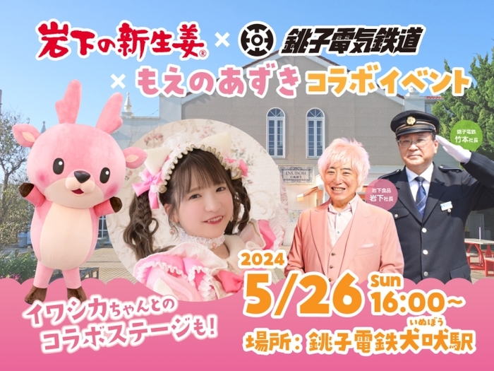 当日は、銚子電鉄の竹本社長、岩下食品社長の岩下和了、岩下の新生姜公式キャラクター「イワシカ®」ちゃんに加え、もえのあずきさんがステージイベントに登場。もえのあずきさんのミニライブもあり、イワシカちゃんとコラボします。入場・観覧は無料です。