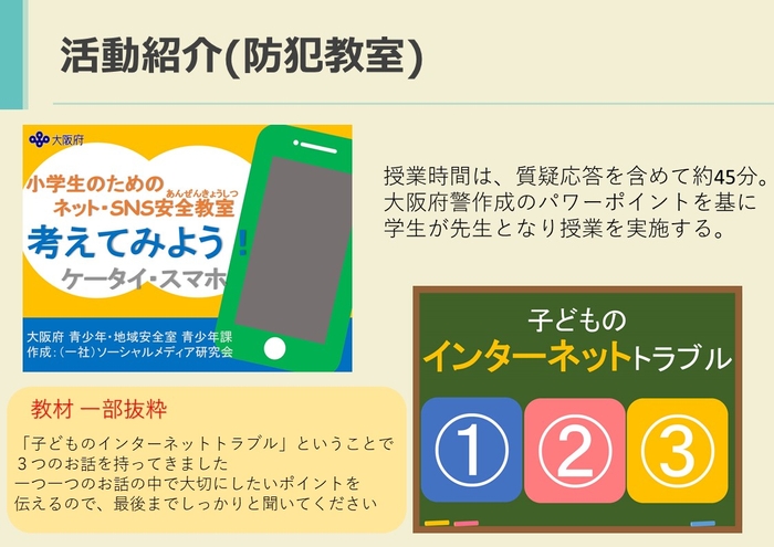 計6府県7団体から、それぞれサイバー防犯ボランティア活動状況の発表があり、本学は大阪代表として、「大阪府内小学校に対する防犯教室の実施(リモート・対面)と防犯啓発リレー動画について」約10分間発表。