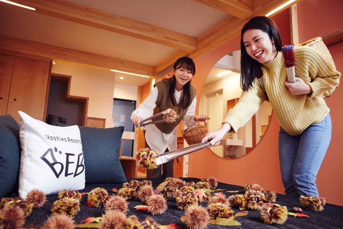 ソファーが栗だらけで座れないことがあります。茨城県は栗の生産量が全国1位を誇る名産地。(*1)沢山獲れすぎるので、客室にもスタッフが運びこんでしまいました。座る際には、客室に用意されたトングとカゴを使い、仲間と栗拾いをしてからお寛ぎください。