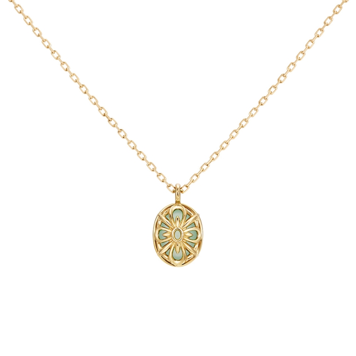つるりとしたカボションカットのチャームが可愛らしく胸元を彩る