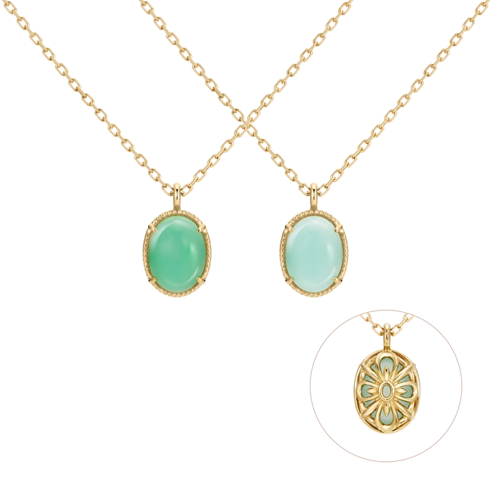 このほどの新作は、ファッションジュエリー「Fiorello(フィオレロ)」シリーズから登場し、トレンドカラーの天然石でグリーン系「クリソプレーズ」と、ブルー系「シーブルーカルセドニー」、つるりとしたカボションカットのチャームが可愛らしいネックレスです。カラーストーンの裏側は、まるで小さな花がそっと咲くような繊細な模様を施しています。コーディネイトに合わせて、どちらの面も表にできるリバーシブル仕様です。