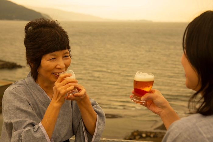 船旅気分を楽しめるオーシャンビューの温泉宿「界 アンジン」では、「母娘 Izu with Beer 滞在」プランを販売します。最上階に位置するサンブエナデッキに用意された母娘専用席で好きなだけクラフトビールを楽しめます。海の景色とビールを気持ちのおもむくままに楽しみながら、リフレッシュできるプランです。