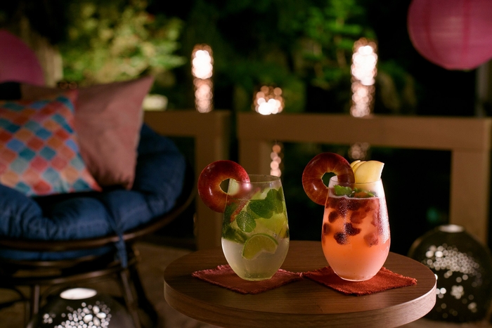 南津軽・大鰐に位置する青森県の温泉旅館「界 津軽」では、「サクラサク、水庭ナイト」を実施します。津軽の文化と四季を感じる「津軽四季の水庭」を望むテラスに、桜や津軽にちなんだデザインの灯籠や提灯が灯り、春の夜を華やかに演出します。思わず写真を撮りたくなるようなフォトジェニックなプライベート空間で、おしゃべりも弾みます。りんごの赤が鮮やかに映える二種類の界 津軽オリジナルカクテルがさらに気分を盛り上げます。