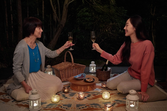・界 阿蘇のテラスを貸し切り、シャンパンと阿蘇のおつまみ(阿蘇五岳を模したボンボンショコラ、生ハム、スモークチーズ等)を堪能