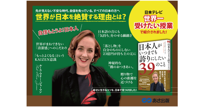 2月12日土曜日放送の日本テレビ系列『世界一受けたい授業』にて、『日本人がいつまでも誇りにしたい39のこと』著者のルース・マリー・ジャーマンさんが講師として同番組5回目の出演をします。