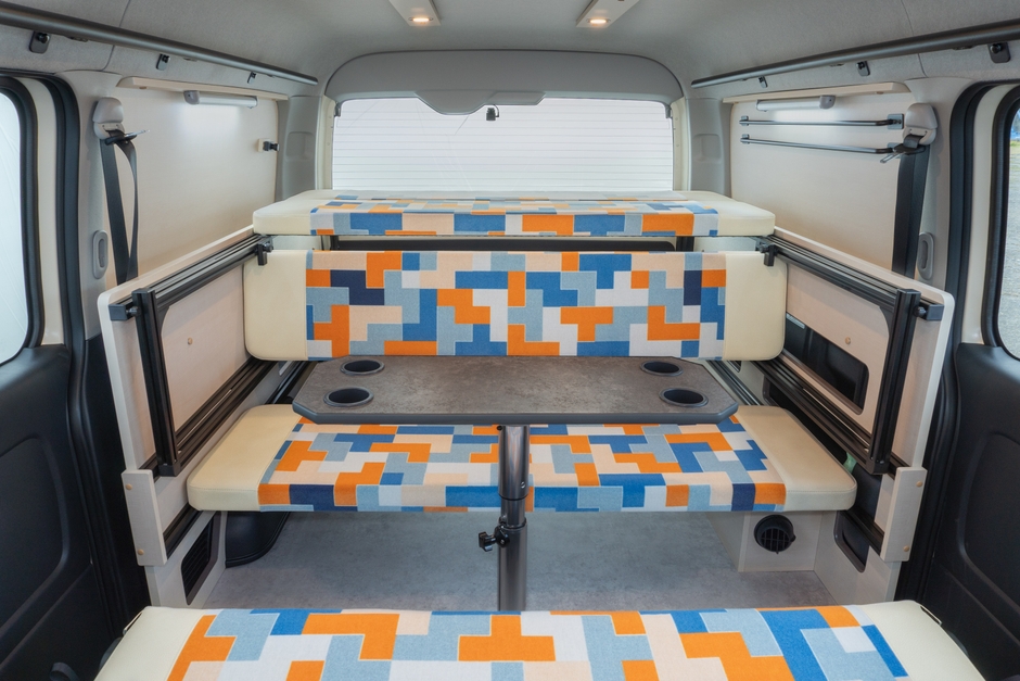 キャンピングカー「アコロ」は、実際に株式会社キャンピングカーランド販売するモデルで、若い女性、インテリアアートなどに敏感なお客様に対して訴求できるデザインになっています。飛行機や鉄道のシート生地で有名な、住江織物が制作したワンオフの生地と明るめの内装を組み合わせました。
