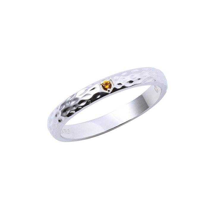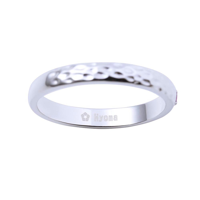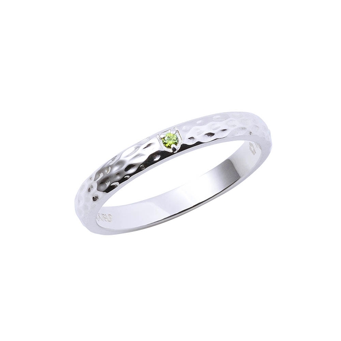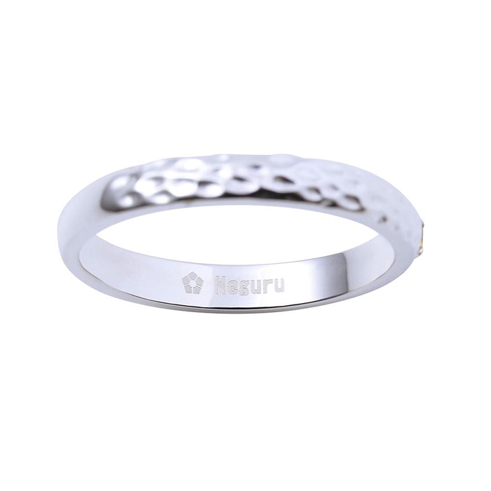 甲丸リングに槌目加工を施し、イメージカラーストーンをセット。作品の世界観をデザインに取り込みました。