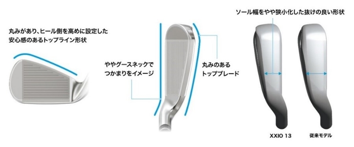 「ゼクシオ 13」は、チタンフェースの4ピース複合構造による徹底した低重心設計とアイアン版「REBOUND FRAME(リバウンドフレーム)」により、高く伸びる弾道をやさしく打つことができます。一方、「ゼクシオ エックス」アイアンは、3ピース鍛造フェース設計で低重心化を実現するとともに、フェース周辺に配置した溝とフェースの肉厚を最適に設計した「MAIN FRAME(メインフレーム)」構造によって鋭く飛び出し、高く伸びる弾道で打つことができます。